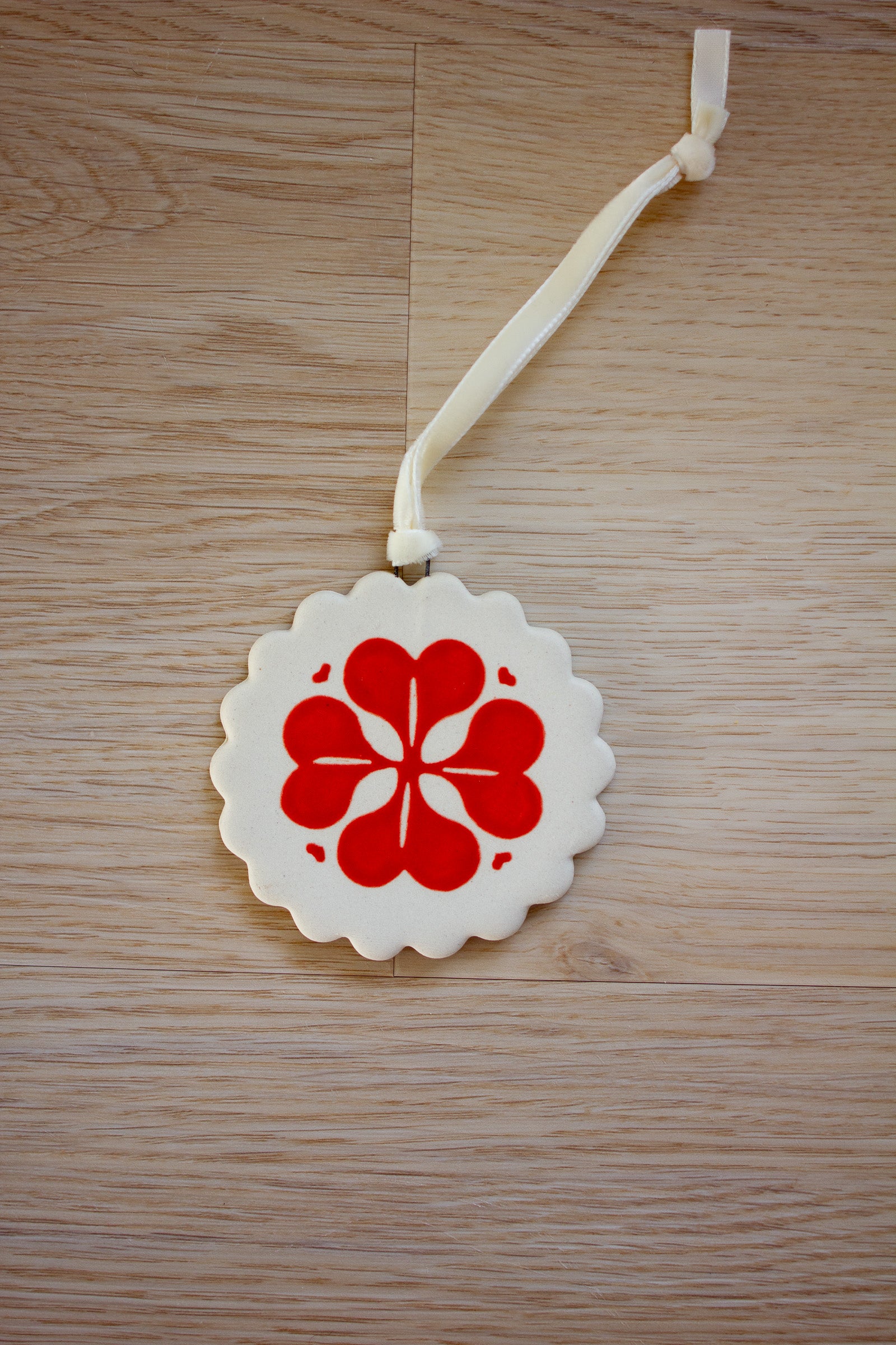 The Folk Ornament was inspired by a design I saw on a milk carton at the Design Museum in Denmark. I made these ornaments with the help of many hands. My husband helped me to translate my vision onto the computer, a friend helped me print the template and my children have helped string the velvet ribbon. The simple design is cheerful and the red-orange will pop against the evergreen of your Christmas tree.
