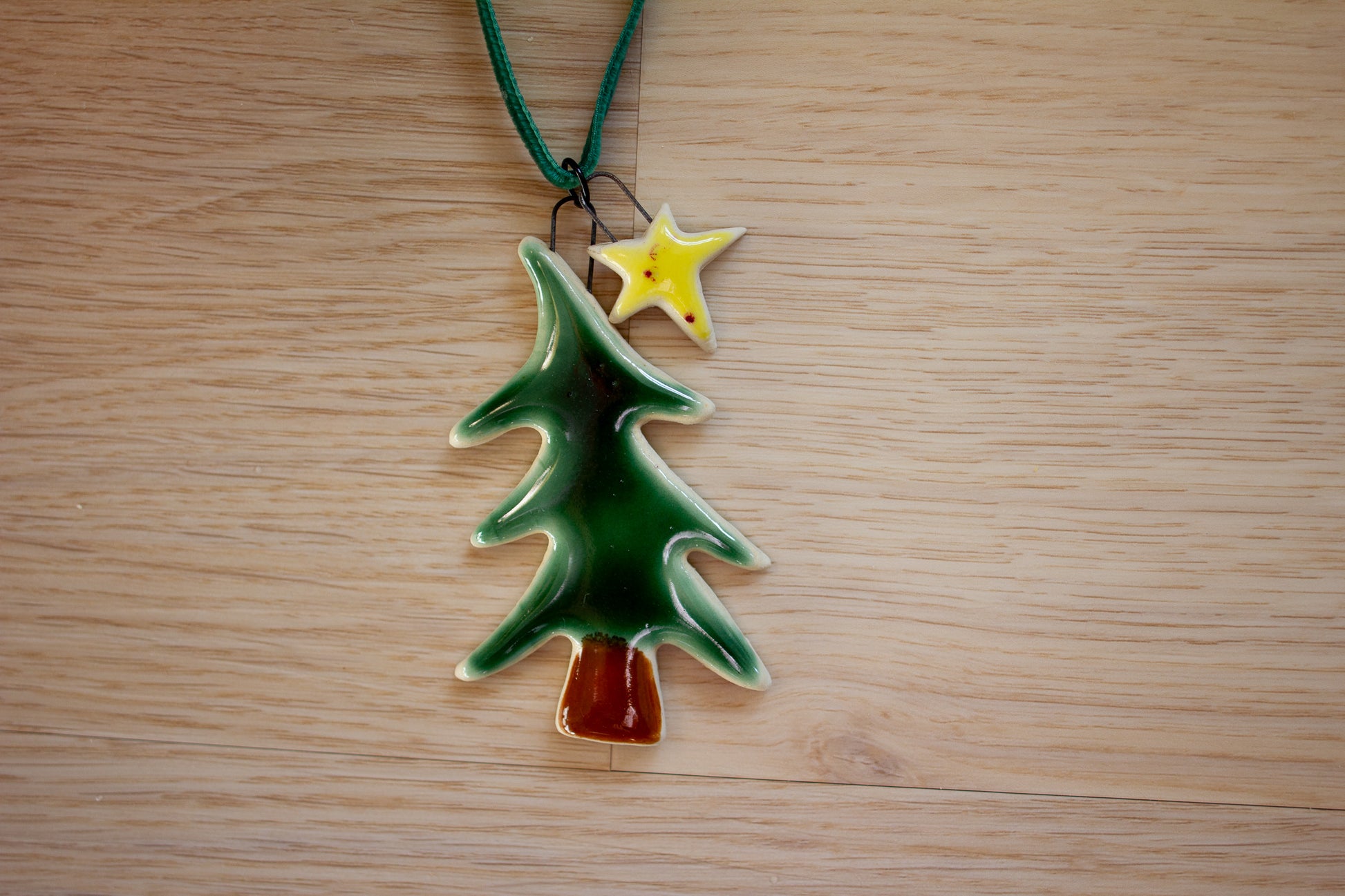 The Yule Tree Ornament is made from two separate pieces. The tree itself is glazed in a glassy emerald green. The second piece is a star in pink or yellow. The star and tree make a tinkling bell-sound together. Connected with a velvet ribbon they make a beautiful addition to your Christmas tree or on top of a gift. Completely handmade in my home studio.